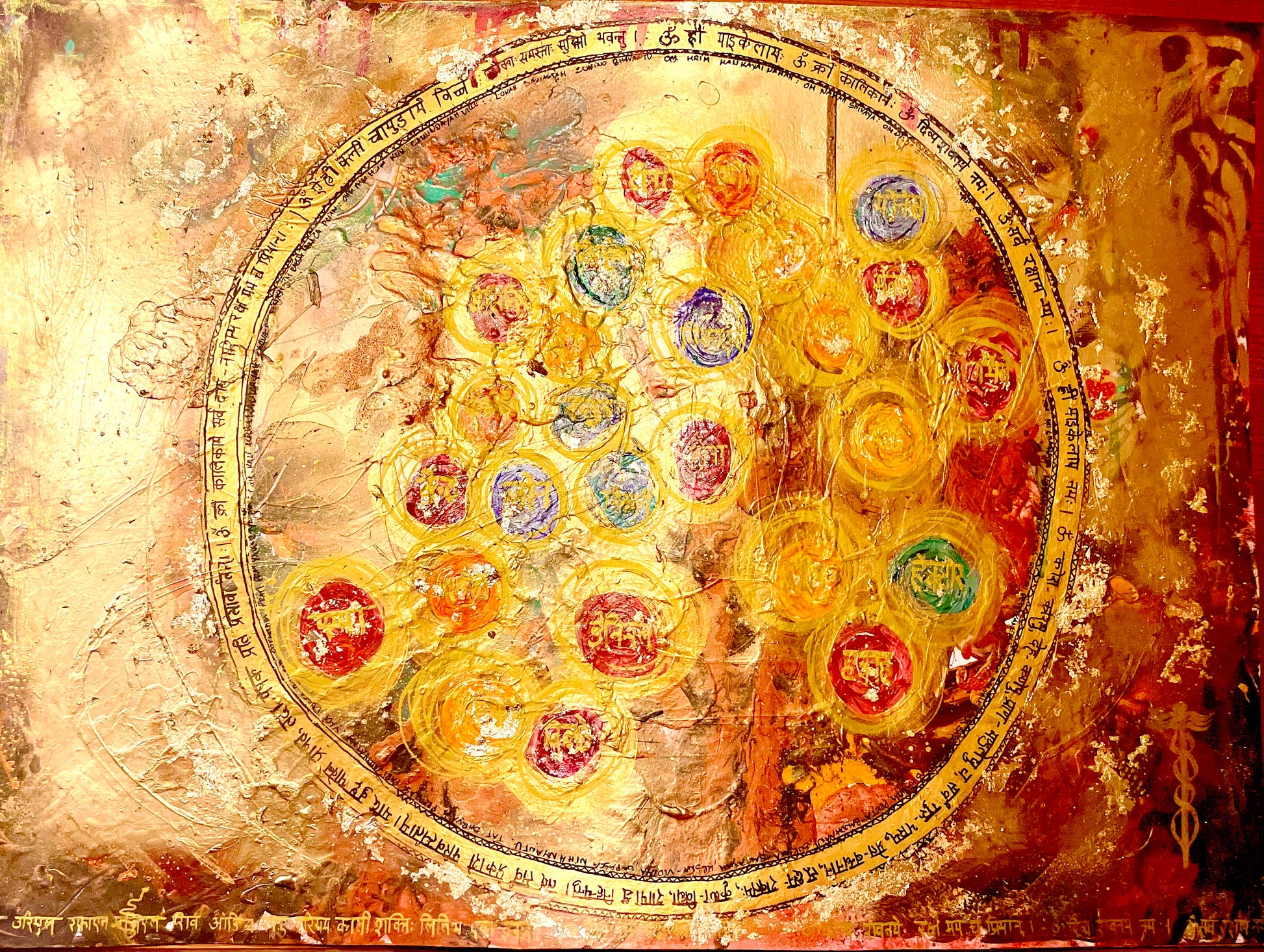 I was guided to create this format through a dream during a period where my family and I were hit by one “accident” after another. In that dream I was shown exactly how to build an energetic shield through paint, symbols, names and sacred mantra-layers. The result was a powerful clearing and protection field — and it worked.