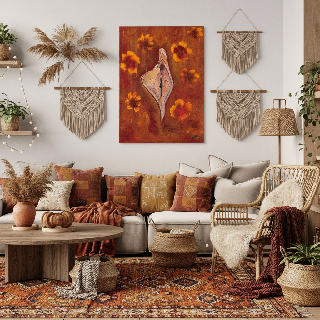 This piece is a celebration of the womb — the glowing center of power, passion, and creation. Bathed in hues of red and orange, it pulses with the heat of life itself. The colors speak of blood, of birth, of flame… of the raw, untamed beauty of the feminine soul.