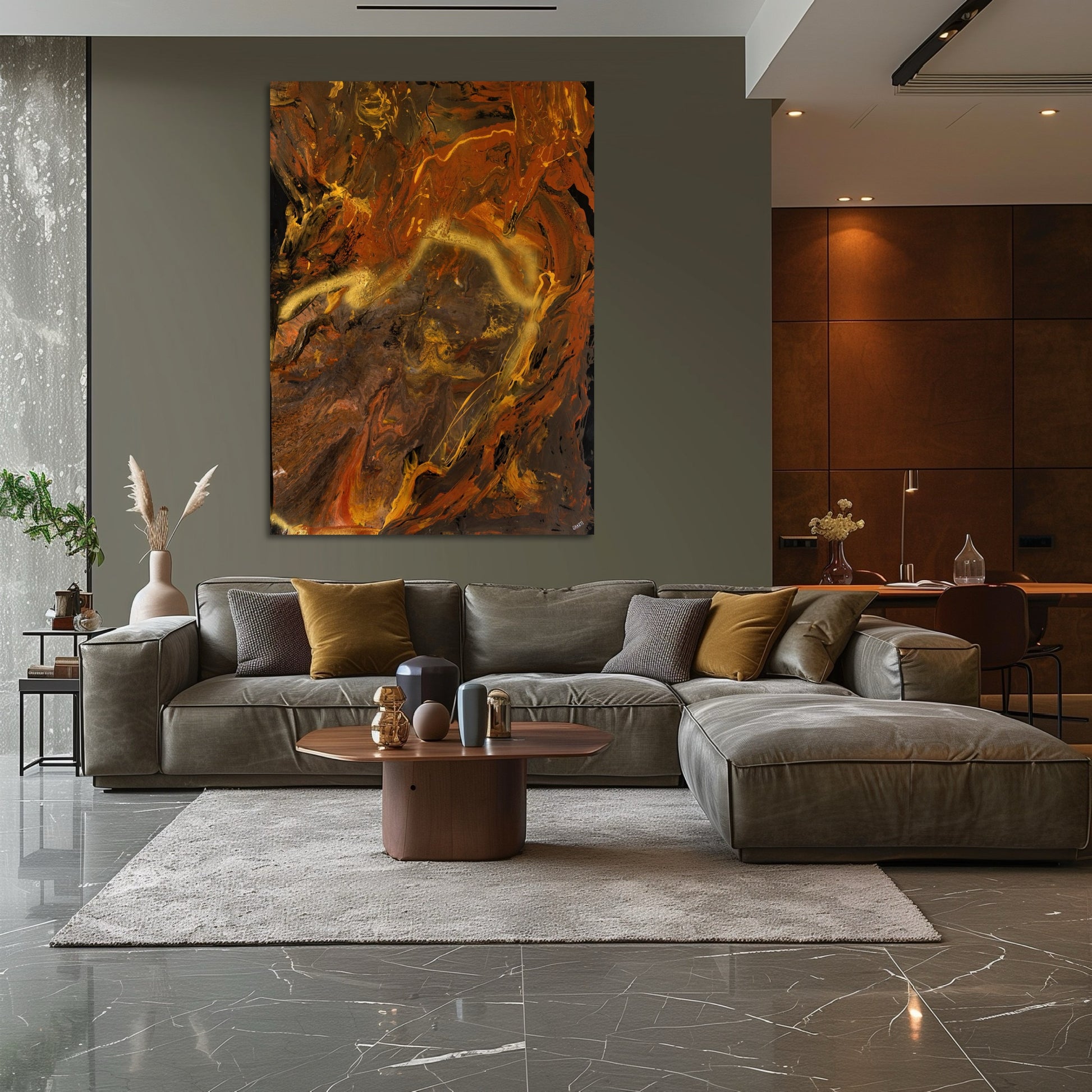 A sensual eruption of color and energy – Pleasure invites you into the raw, untamed pulse of the body. With molten reds, golds, and shadowy depths, this painting explores the ecstatic current that flows through our being when we surrender to feeling.